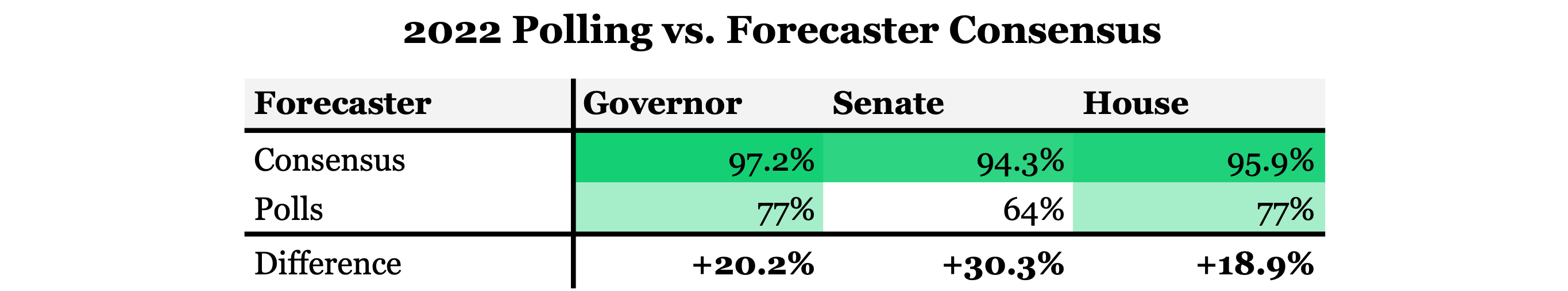As previously mentioned, polling has good years and bad. 2022 was actually a pretty decent year for polling (at least when compared to the historical numbers). On average, polling was only off by 4.8% compared to being off by 6.3% in 2020 and 6.8% in 2016. Although by margins alone it had higher accuracy, polling actually correctly “predicted” the winner in a combined total of 72% of races. This number is actually below the historical average, since 1998, of 78%. This is the smallest percentage of races “called” correctly by polls since 1998, down from the high of 88% in 2008. This is not to say polling should be abandoned as a form of insight in elections. Of course not. Actually, it seems that too many people think about polling in the completely wrong way. Too much is expected of not only polling but forecasting models. Perfect accuracy is impossible. Pollsters and forecasters always attach doubt and uncertainty into the results they produced, but often people like to turn a blind eye and ignore the details.