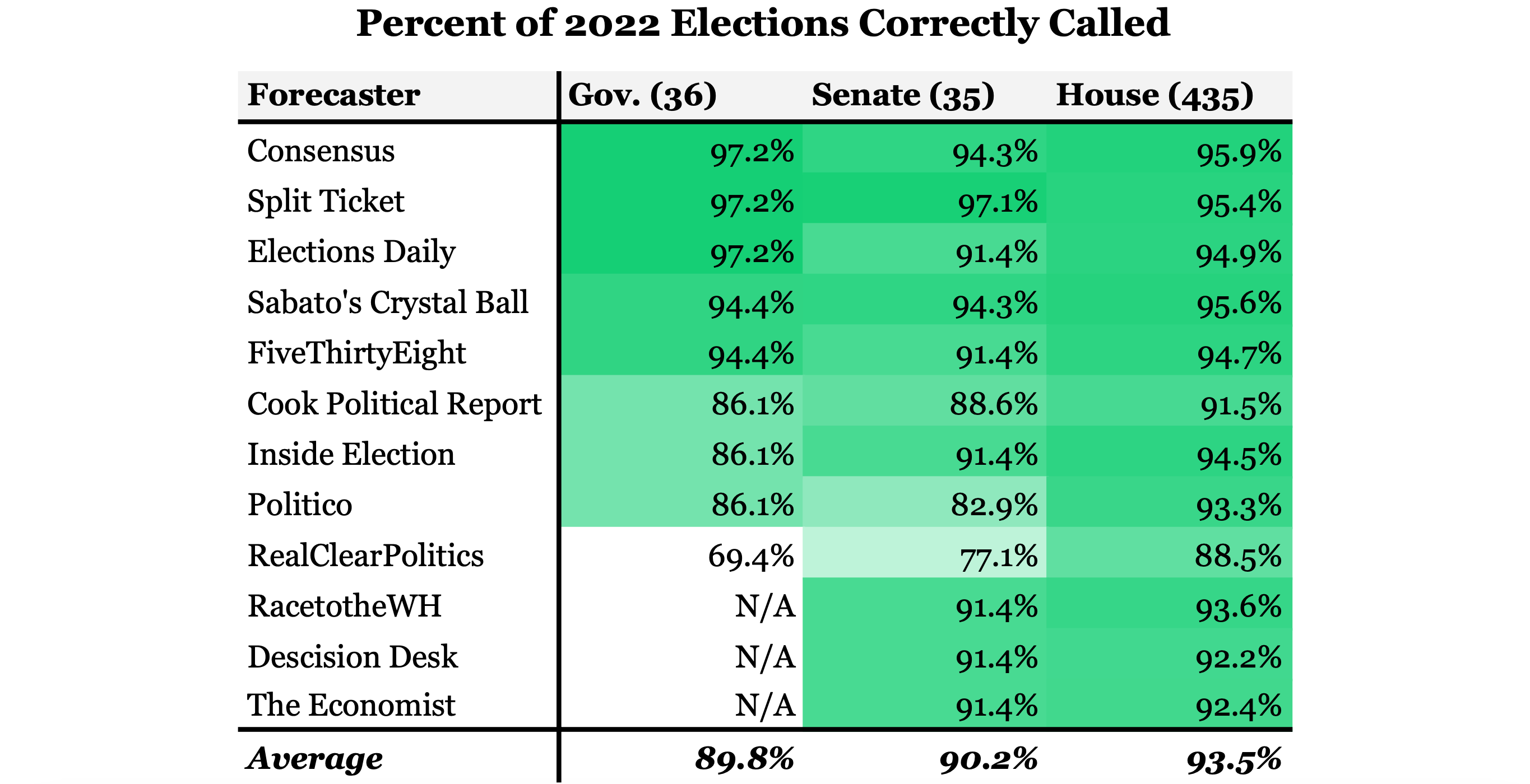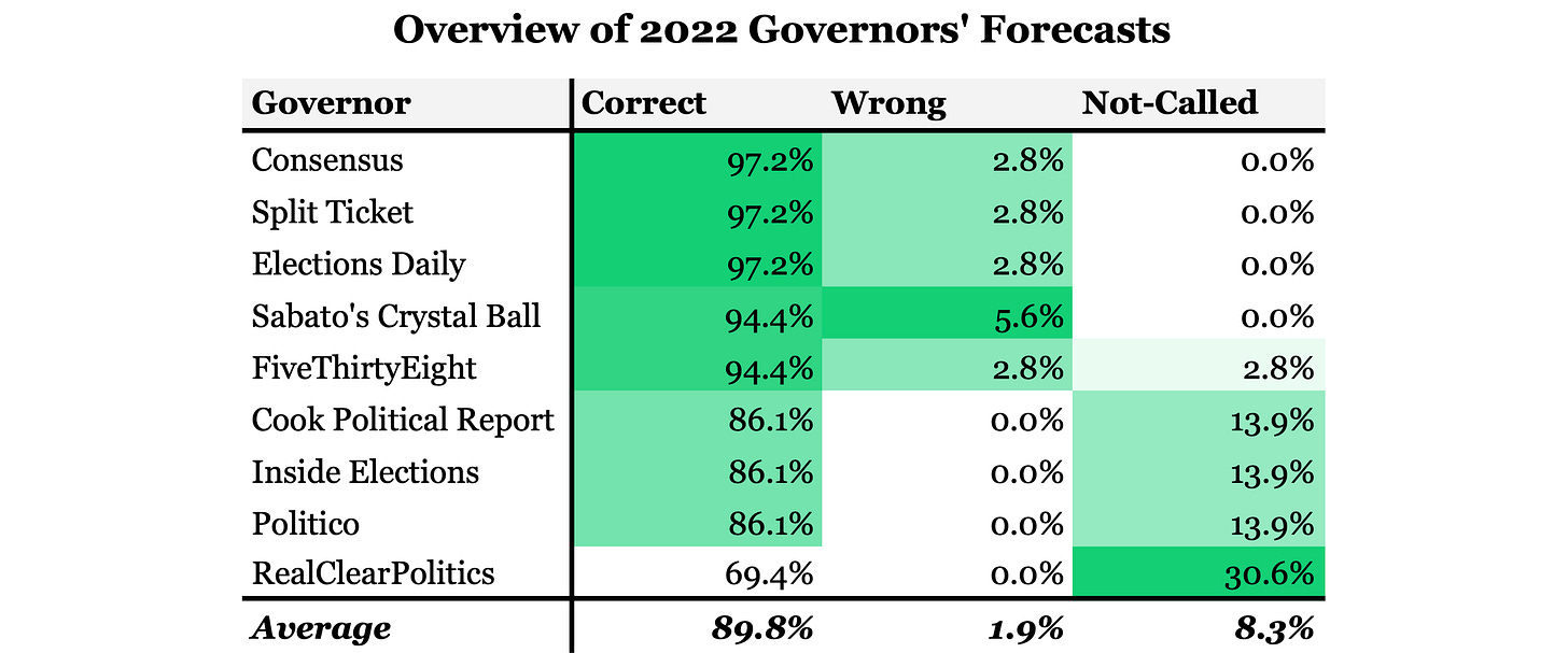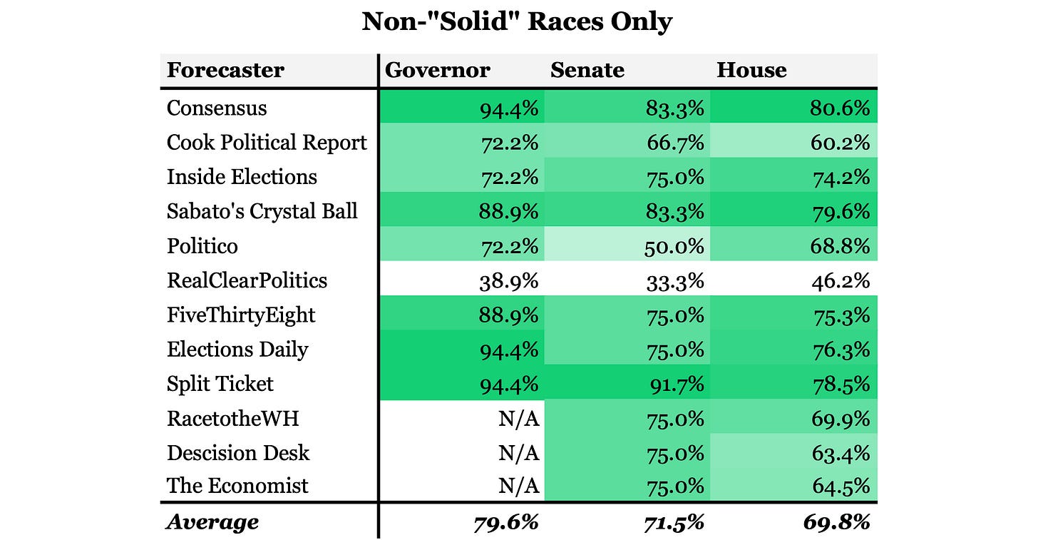 The 2022 election cycle seems to have been a slightly better one for forecasters than 2020. Averaging all prominent forecasters’ seat ratings to get a set of consensus ratings1 shows that forecasters overall only made one wrong call in the Governors’ races. The numbers across the board in congressional elections weren’t all that different. The forecaster consensus correctly called 94.3% of Senate races and 95.9% of House races. Split Ticket leads the pack in overall accuracy, only calling one senate race incorrectly. Sabato’s Crystal Ball called the most House races correctly, but it still called a total of nineteen races for the losing candidate. The numbers overall might seem rather impressive, but that’s really only the case if you ignore the fact that the vast majority of election outcomes are forgone conclusions. Can you really credit someone if they correctly call Nancy Pelosi to win reelection?