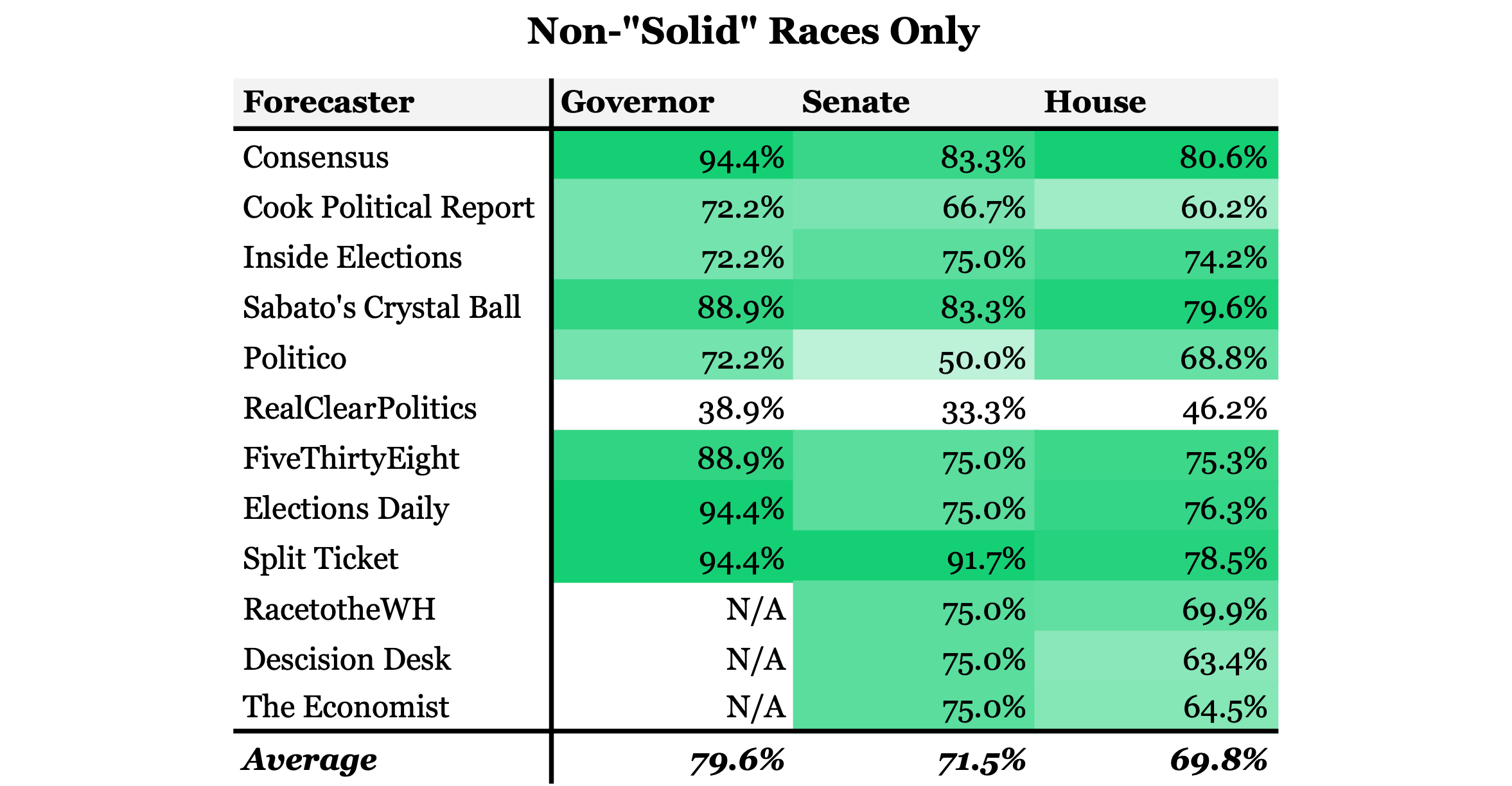 If all consensus Solid Democratic and Republican seats are taken out of the equation only 93 House, 12 Senate, and 18 Gubernatorial races are even potentially competitive. Due to the high accuracy of Senate and Gubernatorial ratings to begin with, there’s very little difference in the percentage of races called correctly. However, the overall accuracy of House ratings’ seems to shrink quite a bit. On average each forecasters called fewer than 70% of the races that were not foregone conclusions. The consensus rating called 80.6% correctly, which is definitely not terrible. Nonetheless, this accuracy score may still be over-inflated, because it still takes into account races in which one candidate does not have a 100% chance of winning, but who is still very likely to win. I’m not trying to down play the accuracy of forecasters, but simply trying to highlight the fact that forecasters lack high accuracy where it matters the most, races in which the outcome is not certain.